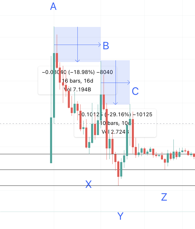 Hãy cùng nhìn vào mô hình 3 với các điểm A, X, B và Y đã được đánh dấu rõ ràng. Sử dụng các bảng từ thấp đến cao, từ mô hình 1 và mô hình 2, khoảng cách trung bình từ thấp đến cao là 4 ngày ở mô hình 1 và 26 ngày ở mô hình 2. Do đó, thời gian để giá đi từ các mức thấp đến cao đã tăng 6.5 lần. Do đó, từ mức thấp đến mức cao tiếp theo, tức là từ Y đến C, sẽ diễn ra sau 26 x 6.5 = 169 ngày.