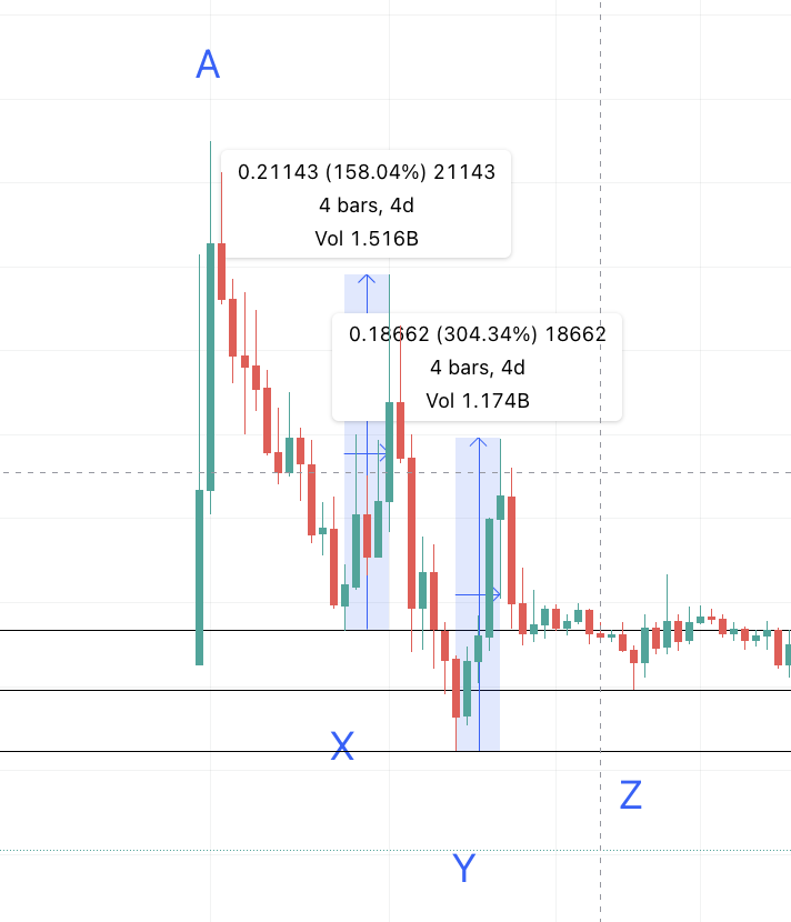 Mức giảm khá nhất quán, nhưng khung thời gian tăng gấp 2.5 lần. Do đó, mức thấp tiếp theo, điểm Z mới, phải là (32 x 2.5) = 80 ngày và ở mức thấp 61.80% Theo đó, SLP có thể chạm đáy ở mức 0.00284 USD vào năm 2023.