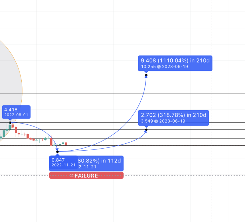 Với khoảng cách trung bình là 112 ngày và giảm 81%, từ mức cao 3.59 USD, giá SNX có thể chạm thấp nhất là 0.655 USD. Tuy nhiên, thực thế thì giá có thể không giảm thấp đến vậy. Giả sử rằng dự án Synthetix Network vẫn tiếp tục phát triển, vào năm 2023, SNX có thể chạm đáy tại mức hỗ trợ 2.440 USD. Đây là mức hỗ trợ xuất hiện khi SNX bắt đầu được giao dịch.