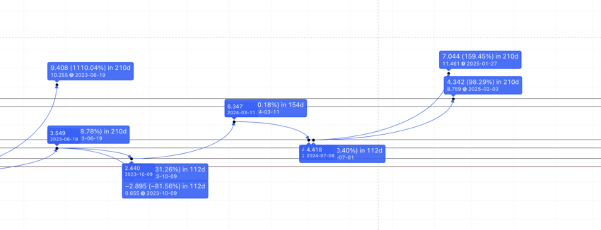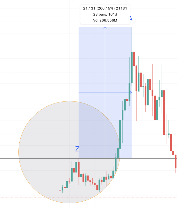 Khoảng cách là 161 ngày. Tỷ lệ phần trăm tăng trưởng là 266.15%. Mô hình không tạo ra một đỉnh khác mà thay vào đó tạo thành một đáy. Bây giờ, chúng ta có thể tính khoảng cách và độ tăng trưởng giữa mức thấp nhất của vùng đầu tiên và đỉnh đầu tiên. Khoảng cách: 210 ngày, mức tăng: 1,111.63%.