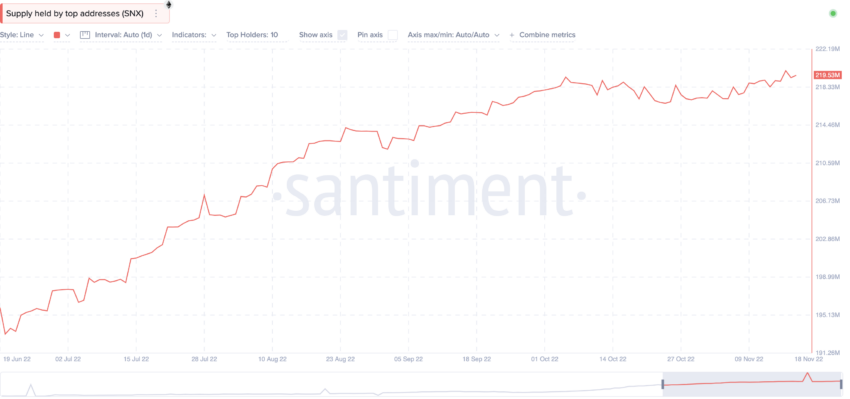 Ngoài ra, lượng token SNX trong các địa chỉ hàng đầu đã tăng đều đặn, cho thấy sự tích lũy của cá voi.