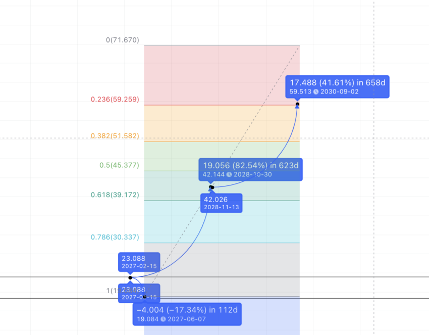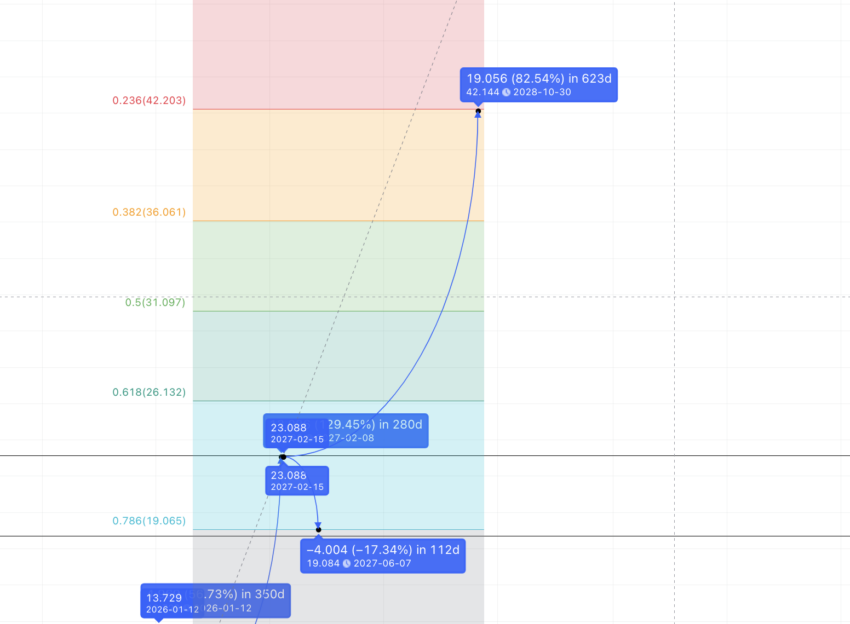 Bây giờ, chúng ta có thể vẽ các mức Fib bằng cách sử dụng mức thấp của năm 2026 và mức cao của năm 2027. Đường cong tăng trưởng tương tự đặt SNX ở mức 42.14 USD vào cuối năm 2028 hoặc đầu năm 2029.