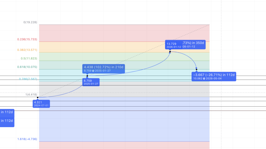 Nếu SNX tiếp tục tuân theo mô hình tăng trưởng tương tự và dự án được áp dụng rộng rãi hơn, chúng ta có thể mong đợi giá SNX sẽ lập mức cao tiếp theo tại 13.729 USD vào năm 2026. Bên cạnh đó, mức thấp nhất có thể nằm ở Fib thoái lui 61.8%, tại 10.062 USD.