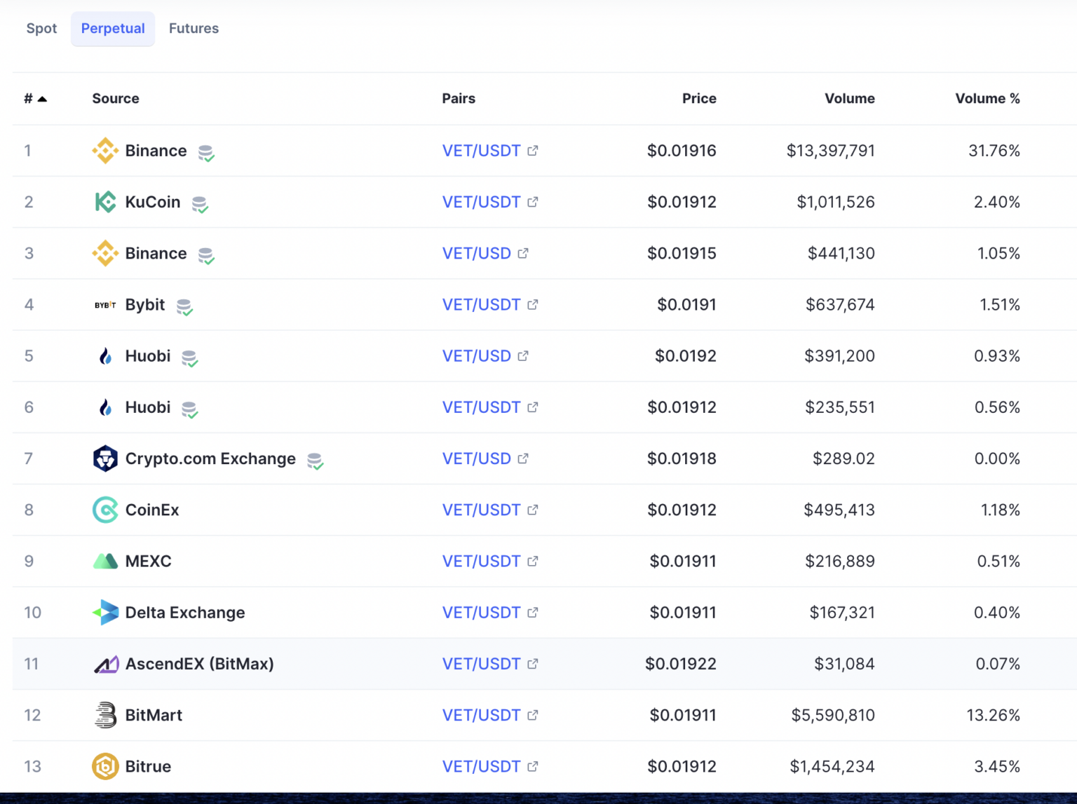 VeChain (VET) hiện đã có mặt trên các sàn giao dịch hàng đầu như Binance, KuCoin và Bitfinex, với một số cặp giao dịch khác nhau, giúp nhà đầu tư dễ dàng giao dịch VET. Trong đó, cặp VET/USDT của Binance hiện đang có khối lượng giao dịch cao nhất, với điểm thanh khoản và niềm tin của các NĐT đều ở mức khá.