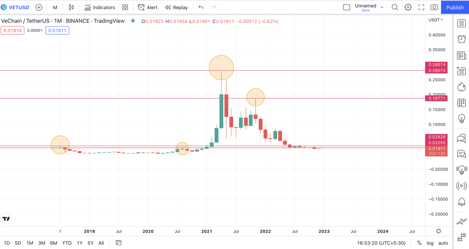 - Chu kỳ tiếp theo bắt đầu khi VET đạt mức ATH là 0.2782 USD vào tháng 4/2021.