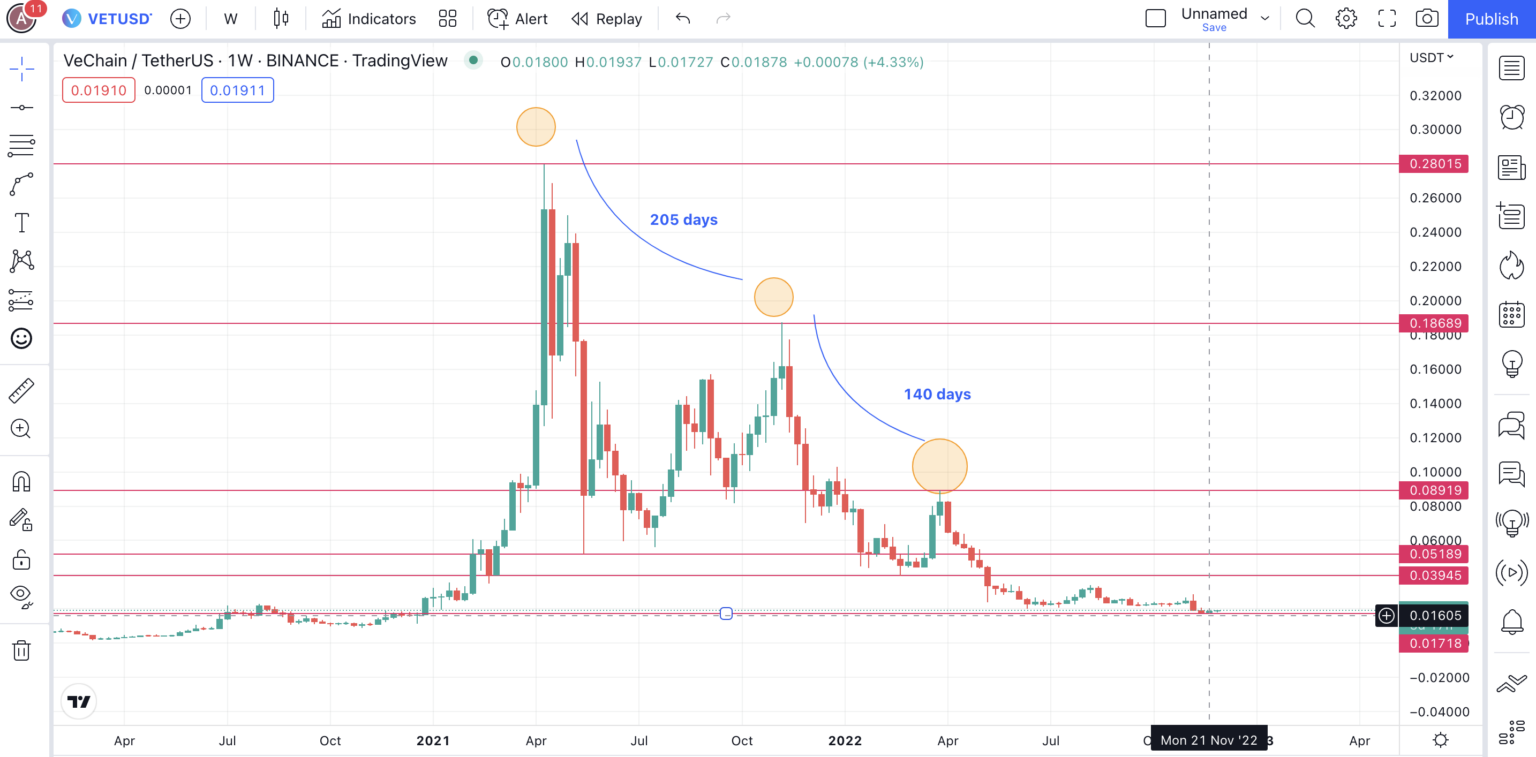 Từ đó suy ra, trong một thị trường tăng giá hoặc đi ngang, giá VET mất ít thời gian hơn để di chuyển từ đáy lên mức đỉnh mới. Xu hướng này có thể tiếp tục sau khi thị trường gấu kết thúc. Biểu đồ dưới đây đánh dấu tất cả các mức giá chính đang được thảo luận.