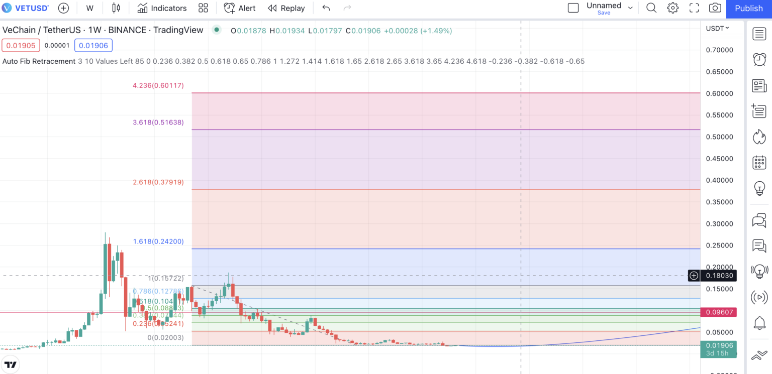 Biểu đồ Fibonacci thoái lui cho chúng ta biết về các mức kháng cự và hỗ trợ chính. Ở đây mức 0.089 USD, trùng với Fib 50%. Theo dự đoán củ BeInCrypto, VET dự kiến sẽ đạt được mức này vào năm 2024.