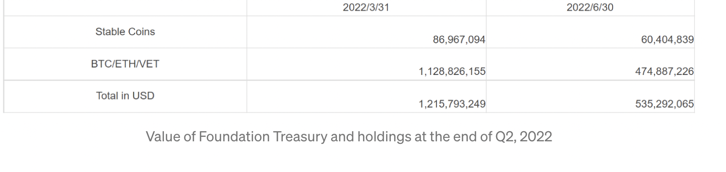 - Tổng giá trị tài sản do VeChain Foundation nắm giữ đã giảm 44% so với Q1/2022.
