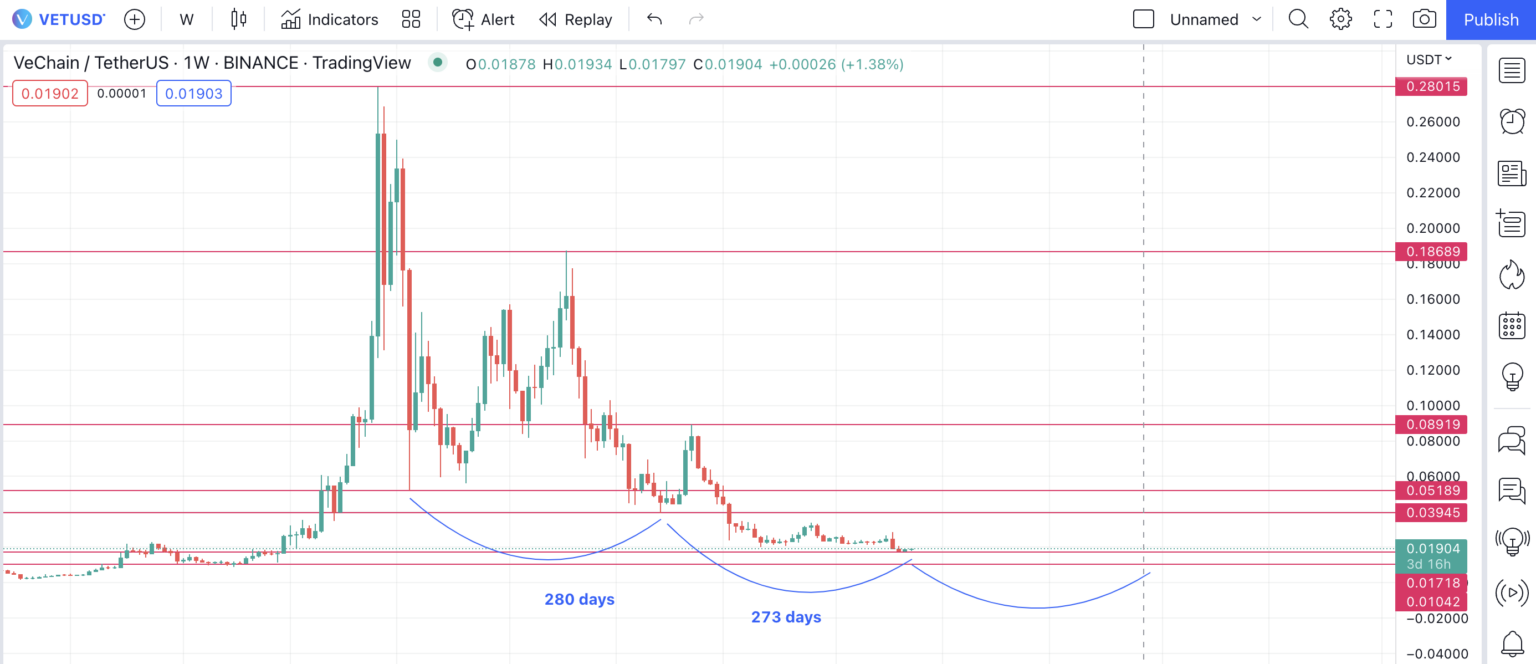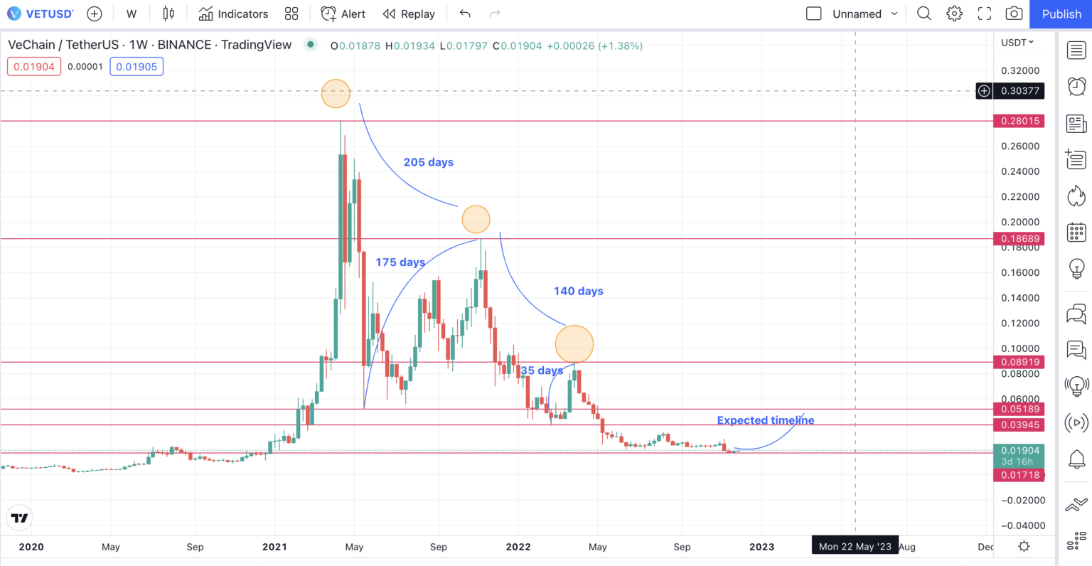 Suy ra, đỉnh thấp hơn tiếp theo có thể là tương đương mức giảm 42.5% (trung bình của hai mức 33% và 52%). Nói cách khác, mức đỉnh tiếp theo của VET dự kiến ở 0.0511 USD. Vậy, khi nào giá VET sẽ đạt đến mức này?