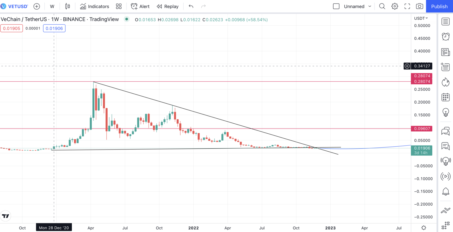 Mẫu biểu đồ tuần của VET cho thấy ba đỉnh thấp hơn đã hình thành. Điều này cho thấy VET đang trong một xu hướng giảm.