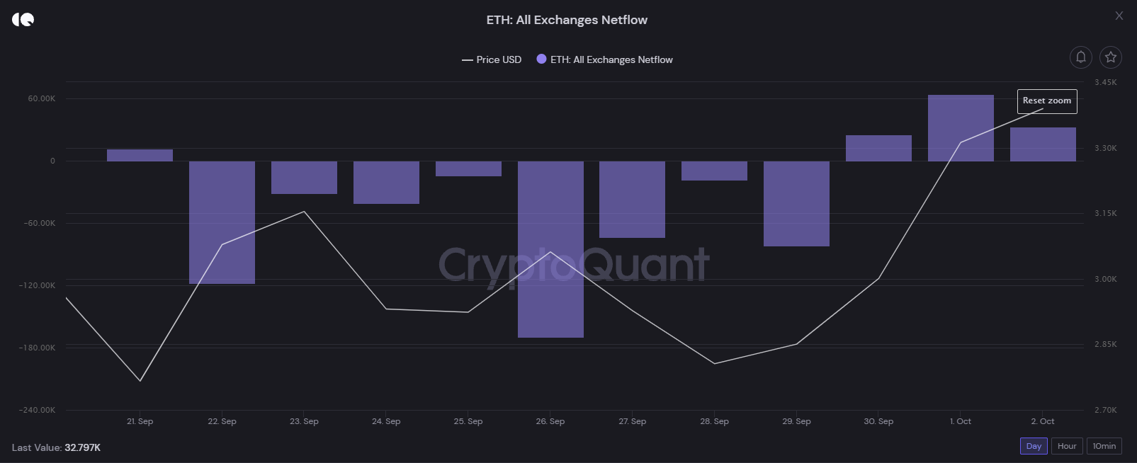 Theo quan sát, những holder lâu năm này dường như có xu hướng tích lũy nhiều hơn vào những ngày cuối của tháng 9. Ngược lại, những ngày đầu tháng 10, chúng ta thấy một tỷ lệ BTC được đưa lên các sàn giao dịch nhiều hơn. Diễn biến này cũng xảy ra tương tự với những người đang nắm giữ ETH. Có hơn 340,000 ETH rời khỏi các sàn giao dịch những ngày cuối cùng của tháng 9. Ngay sau đó, những ngày đầu tháng 10 có khoảng hơn 100,000 ETH được đưa lên lại ở các sàn giao dịch.