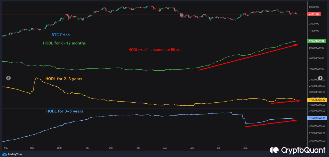 Khi giá BTC giảm về vùng từ 40,000 USD – 43,000 USD, chúng ta luôn thấy có một lực mua vào mỗi khi giá giảm. Và điều này được giải thích nhờ hành vi tích cực mua vào của các holder lâu năm. Phần lớn họ là những người có thời gian nắm giữ BTC trong thời gian từ 6 tháng trở lên.