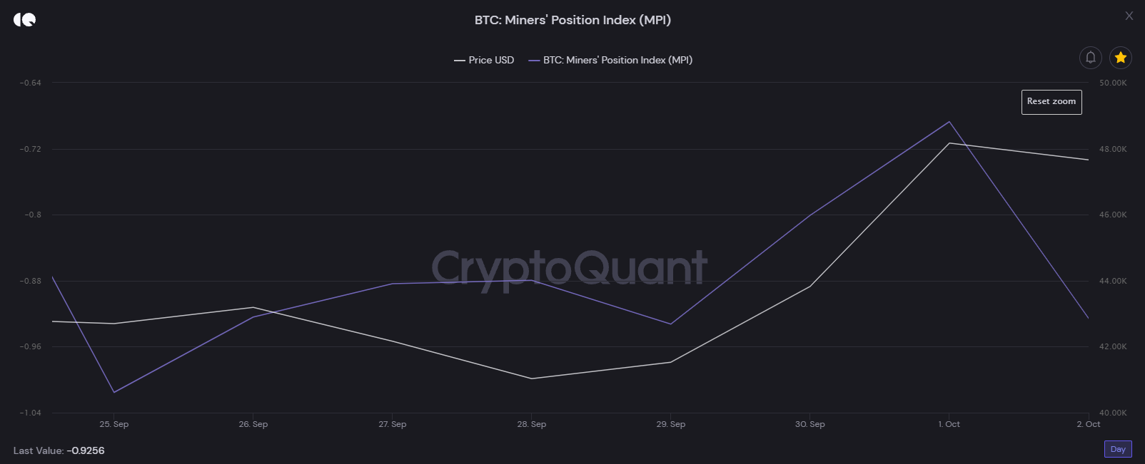Hiện tại, chỉ số on-chain MPI hiện đang dao động quanh vùng số âm. Tại thời điểm mình viết bài này, chỉ số MPI hiện ở mức -0.9256. Mặc dù gần đây giá BTC có dấu hiệu hồi phục nhưng tỷ lệ bán của các miner không quá lớn. Có vẻ như, đối với miner, thời điểm này, mức giá BTC hiện tại vẫn còn khá rẻ.