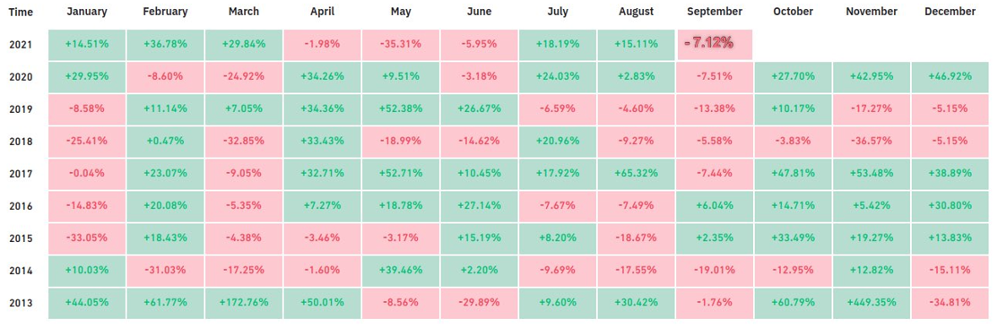Trong lịch sử từ năm 2013 đến nay, tháng 9 vốn là một tháng đen tối đối với Bitcoin (BTC). 6 trên 8 năm, giá BTC đều chứng kiến xu hướng giảm vào thời điểm tháng 9. Mức giảm dao động từ 6% – 19%. Và tháng 9/2021 vừa rồi cũng không phải là ngoại lệ. Theo thống kê, giá BTC giảm khoảng 6.98% dựa theo dữ liệu chung trên sàn Coinbase. Kết thúc tháng 9, BTC đóng nến tháng ở mức 43,824 USD, ETH ở mức 3,000 USD.