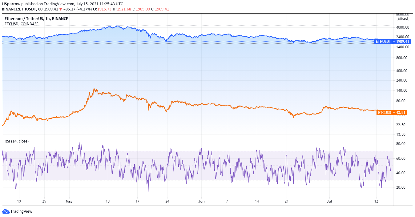 Sự khác biệt về giá ETC và giá ETH ngày càng lớn. Nhưng có vẻ chúng đi theo cùng một mô hình. Cả hai đều đã có một đợt tăng giá vào năm 2017, giảm vào năm 2018 và tăng trở lại vào năm 2021.