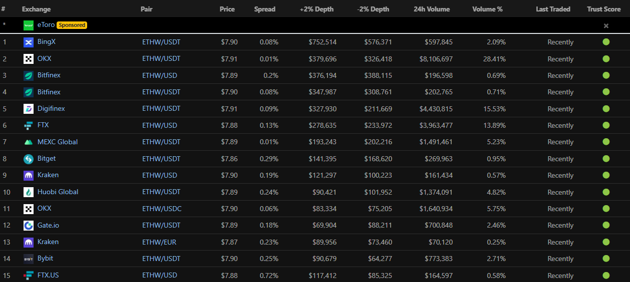 Theo ghi nhận của BeInCrypto, hầu như tất cả các sàn giao dịch hỗ trợ niêm yết ETHW ở thời điểm hiện tại đều là các sàn CEX. Một số cái tên có thể kể đến như OKX, Huobi Global, Gate.io hay FTX của Sam Bank-Fried…