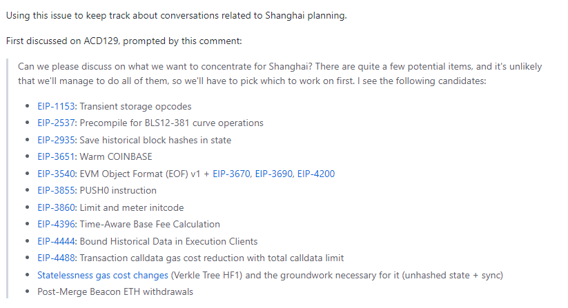 Ngoài ra, ban đầu các nhà phát triển cũng đã đồng ý triển khai EVM Object Format (EOF) ở bản cập nhật Thượng Hải. Đây là tập hợp các EIP nâng cấp Máy ảo Ethereum gồm EIP – 3540, EIP – 3670, EIP – 4200, EIP – 4570 và EIP – 5450. Tuy nhiên, có vẻ như việc triển khai EOF đã không thành công ở thời điểm BeInCrypto viết bài này. Do đó, trong bản nâng cấp Shanghai sắp tới sẽ không có tính năng này. EOF có thể được kết hợp với EIP – 4844 ở giai đoạn tiếp theo.
