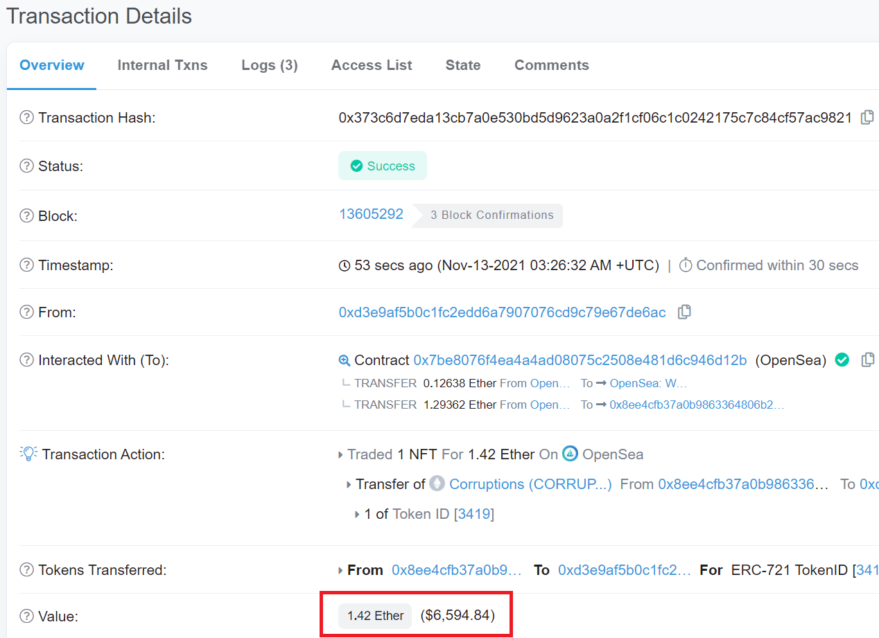 Trong ví dụ ở ảnh trên, chúng ta có thể thấy rằng ai đó đã giao dịch NFT từ OpenSea, với giá khoảng 6,600 USD.