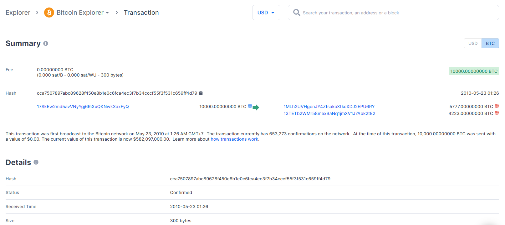 Hình trên đây cho chúng ta một ví dụ về một block explorer của mạng lưới Bitcoin (BTC). Đó là một giao dịch sử dụng 10,000 BTC để mua 2 chiếc Pizza ngày 23/5/2010.