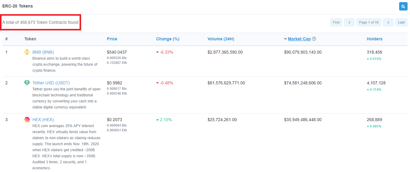 Nếu bạn đang tìm kiếm một trong hàng nghìn altcoin hoặc token theo chuẩn ERC-20 thì Etherscan là công cụ tốt nhất cho việc này. Trên thực tế, bằng cách sử dụng nền tảng này, bạn sẽ có được cái nhìn tổng quan chính xác nhất về hệ sinh thái Ethereum. Với Etherscan, bạn có thể thấy mức độ phổ biến của mã thông báo, số lượng người nắm giữ, vốn hóa thị trường và khối lượng giao dịch.