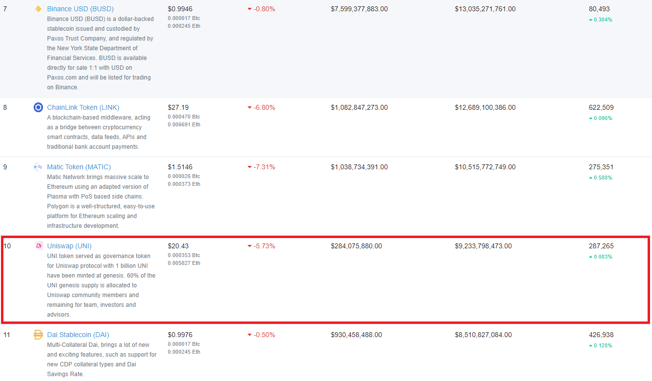 Hãy nhớ danh sách các token là cách tốt nhất để có cái nhìn tổng quan về hệ sinh thái của Ethereum. Đây cũng là cách nhanh nhất để xác minh xem bạn có đang gửi tiền điện tử đến đúng hợp đồng thông minh hay không. Ví dụ, nếu bạn nhấp vào địa chỉ hợp đồng của Uniswap, toàn bộ thông tin tổng quan về hợp đồng này sẽ được hiển thị, từ nguồn cung cấp và chủ sở hữu tối đa cho đến giá trị thị trường.