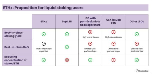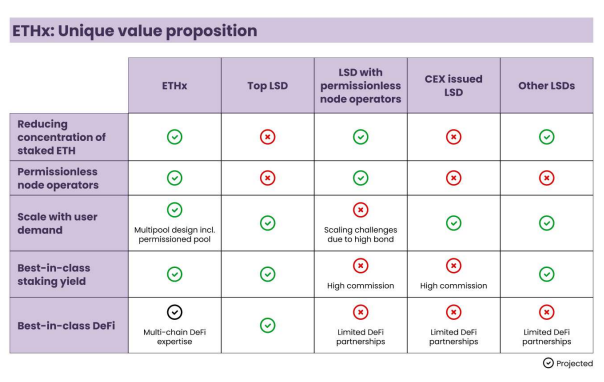 Sponsored Sponsored- Một là đối với home staker: Nó như một vòng tròn khép kín vậy. Khi người dùng thấy rào cản gia nhập thấp và tỷ lệ lợi nhuận cao thì họ sẽ dễ dàng trở thành một home staker. Điều này sẽ khiến nó trở nên phi tập trung hơn nhiều so với các hình thức khác. Bảng dưới đây cho thấy ưu điểm của ETHx so với các giải pháp LSD khác.