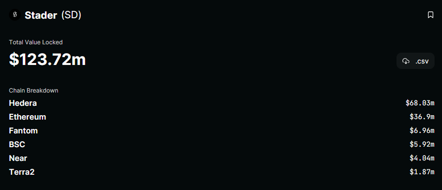 Tại thời điểm BeInCrypto thực hiện bài viết này, Stader đã được triển khai trên tất cả 6 chain khác nhau gồm Hedera, Fantom, Polygon, BNB, Terra 2.0 và Near. Theo dữ liệu từ DefiLlama, TVL của Stader hiện ở mức 123.72 triệu USD. Trong đó, phần lớn đến từ giao thức Hedera.
