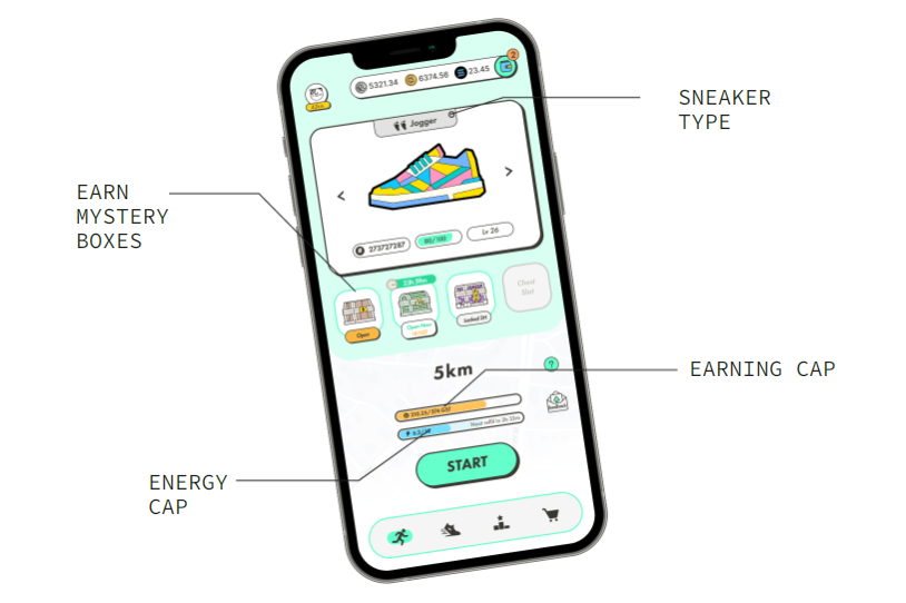 Mỗi người dùng có thể sử dụng nhiều loại giày chạy khác nhau và có thể đổi qua lại giữa các loại trong quá trình di chuyển với tính năng “Change Sneaker”. Ngoài ra, quá trình di chuyển sẽ được theo dõi thông qua hệ thống GPS. GPS càng mạnh thì tỷ lệ kiếm được GST càng nhiều và ngược lại.