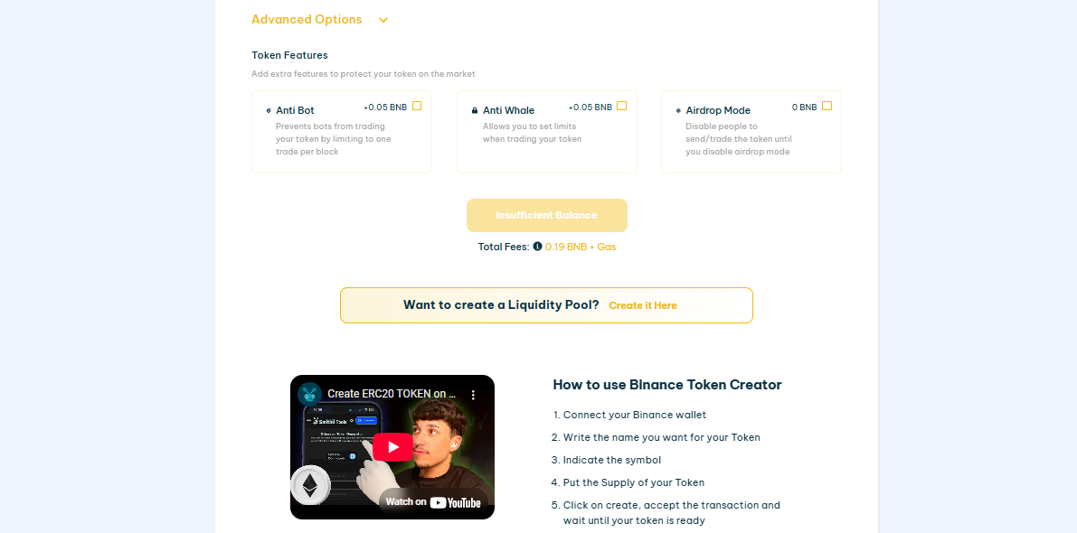 Bạn sẽ cần ít nhất 0.19 BNB để khởi chạy meme coin của mình và thêm 0.05 BNB để thêm tính năng Chống Bot hoặc Chống Whale trên Smithii.