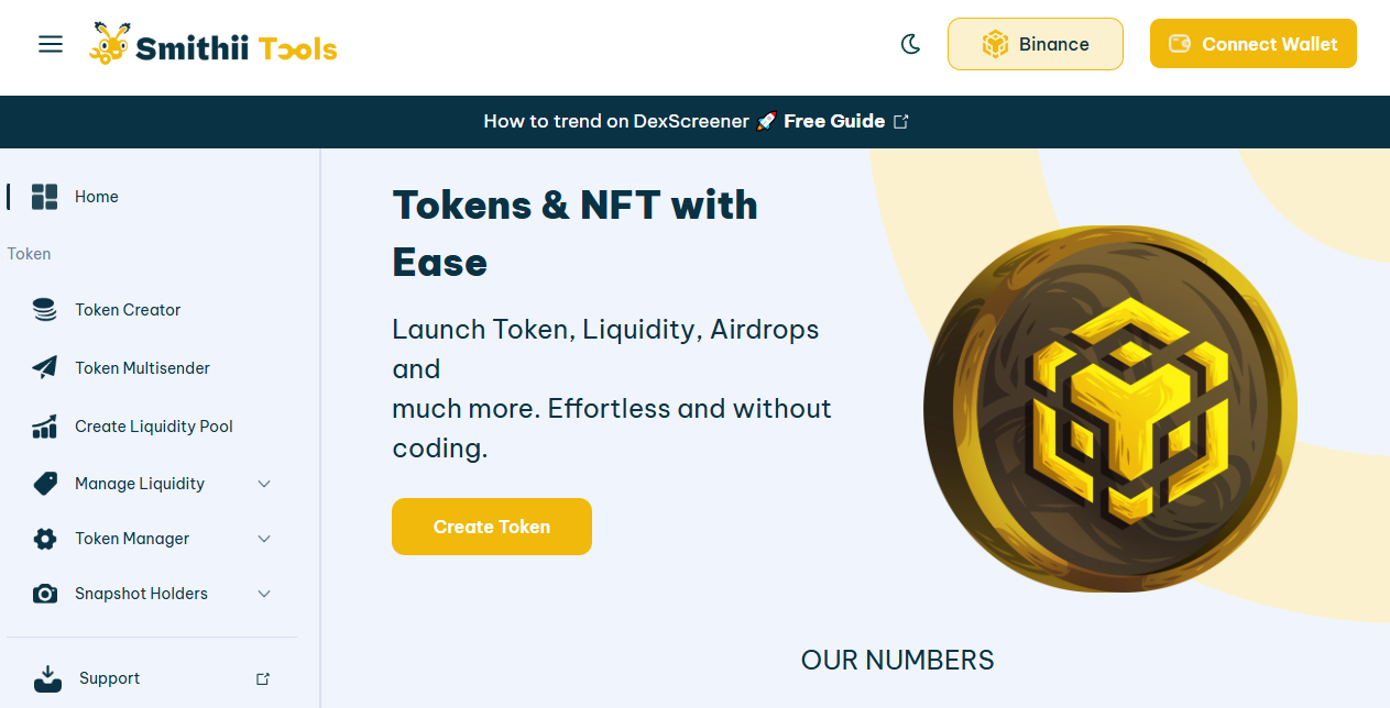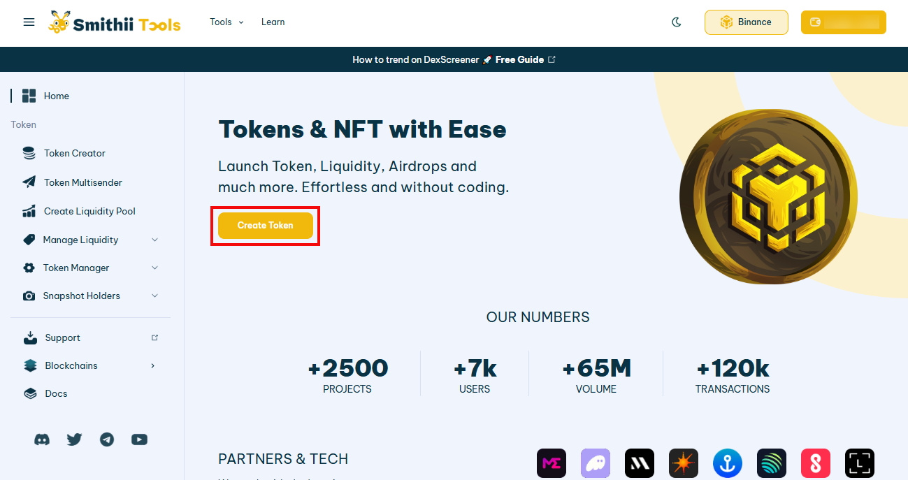 Đối với hướng dẫn này, chúng ta sẽ sử dụng Smithii để tạo đồng tiền meme trên BNB. Smithii là giải pháp trọn gói dành cho những người sáng tạo web3 muốn ra mắt token và NFT mà không cần phải viết mã (code).