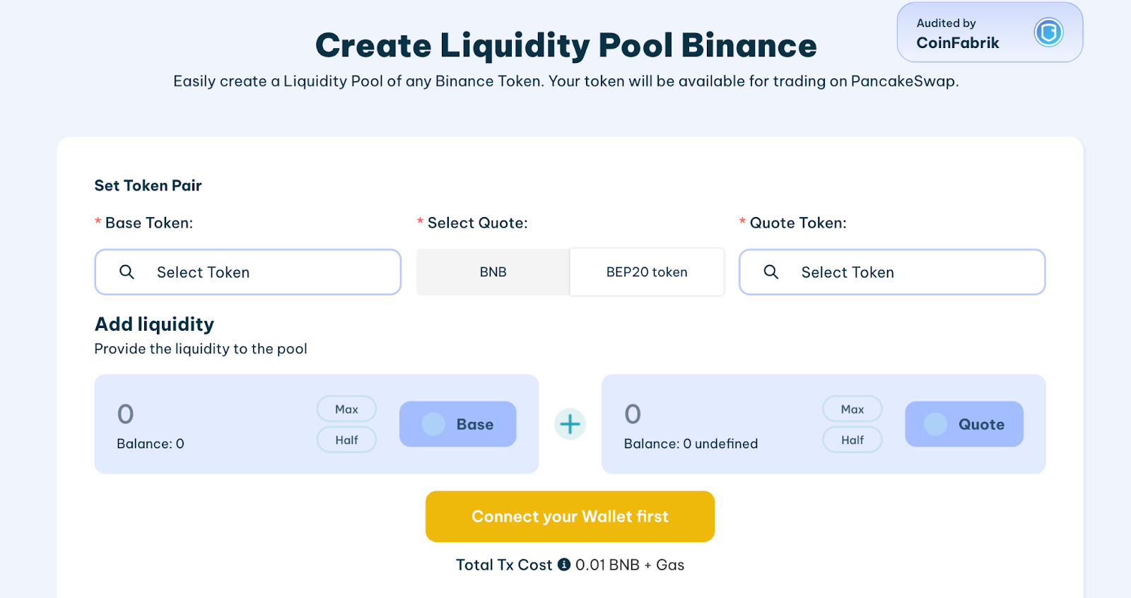 Với mục đích đó, chúng tôi sẽ sử dụng trình tạo nhóm thanh khoản cho PancakeSwap. Điều này sẽ cho phép bạn tạo một cặp giữa token của chúng tôi và bất kỳ token nào khác. Trường hợp sử dụng phổ biến nhất là ghép nối với BNB hoặc bất kỳ stablecoin nào khác. Sau khi bạn thêm thanh khoản, token của bạn sẽ hoạt động trên PancakeSwap!
