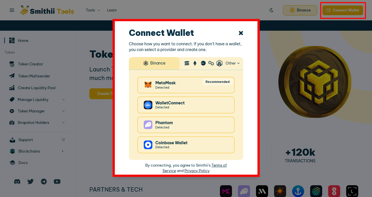 4. Kết nối với công cụ Smithii: Nhấn nút Kết nối ví để đăng nhập vào ví của bạn. Trong menu bật lên, hãy chuyển sang BNB Smart Chain. Tiếp theo, chọn MetaMask hoặc ví web3 phù hợp để kết nối với nền tảng.