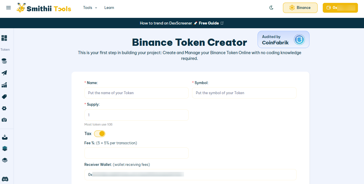 6. Hoàn thành biểu mẫu: Điền vào biểu mẫu với tên, ký hiệu và nguồn cung cấp mã thông báo của bạn. Bạn cũng có thể chọn thu thuế cho mọi giao dịch được thực hiện bằng mã thông báo. Biểu mẫu sẽ tự động điền địa chỉ ví của bạn, nhưng bạn có thể nhập địa chỉ ví khác để thu thuế.