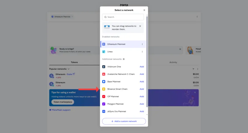 2. Chuyển sang chuỗi khối BNB: Trong ví của bạn, hãy chuyển sang mạng BNB.