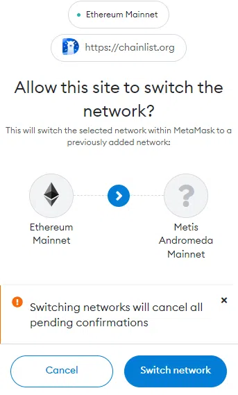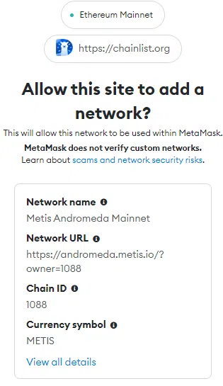 - Nhấp vào nút “Approve” để phê duyệt giao dịch trên cửa sổ MetaMask. Thao tác này sẽ thêm Mainnet Metis Andromeda vào tiện ích mở rộng trình duyệt ví MetaMask.