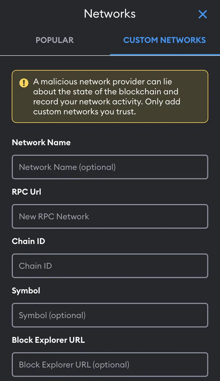 - Nếu Metis không có trong danh sách mặc định do MetaMask cung cấp, hãy nhấn vào tab có nhãn “Custom Networks” để thêm mạng tùy chỉnh.