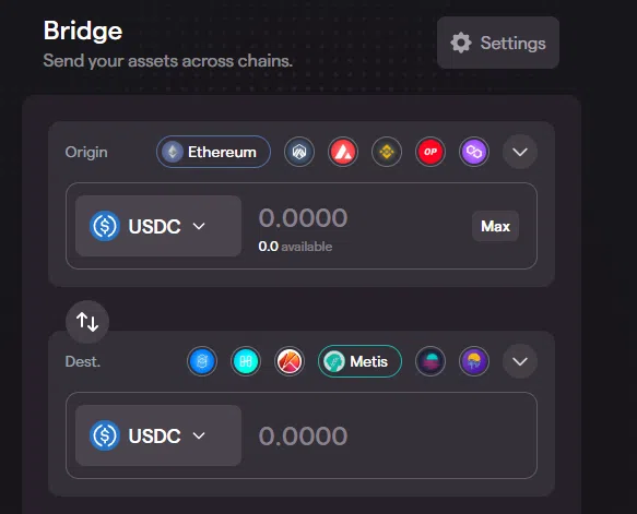 - Chọn Ethereum làm mạng gốc và Metis làm mạng gửi đến.