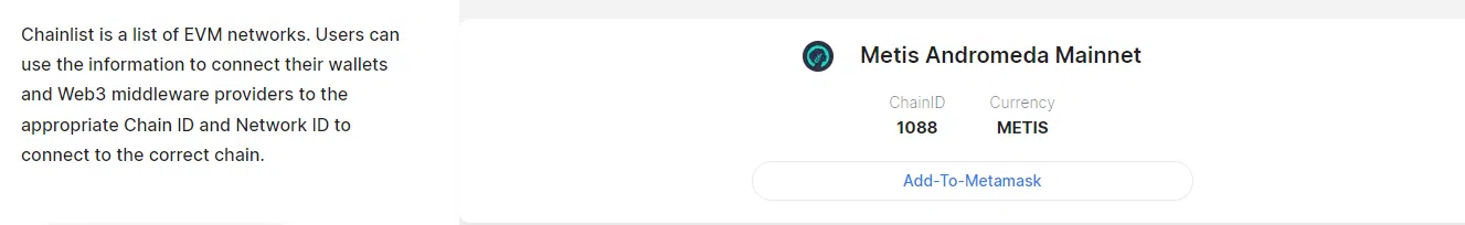 Chainlist liệt kê các mạng EVM như Metis và các Ethereum L2 khác. Để sử dụng tùy chọn này, hãy làm theo các bước sau: