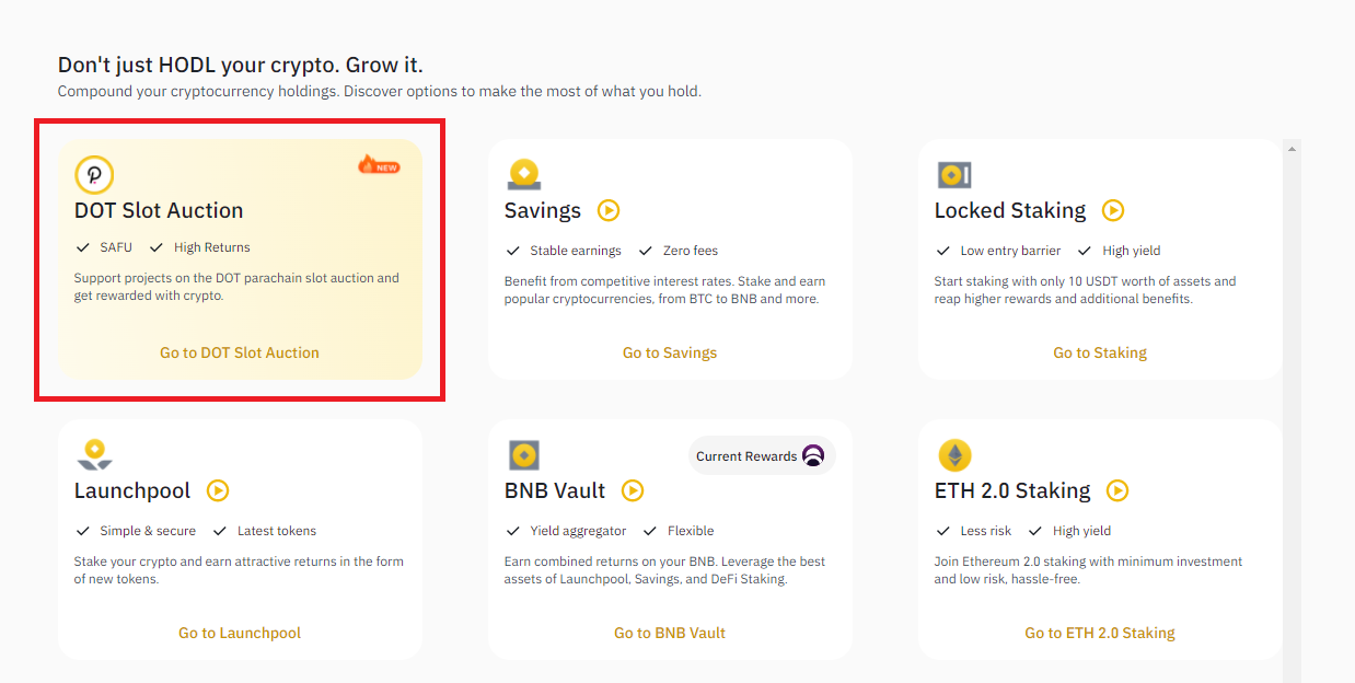 Để hỗ trợ nhà đầu tư trong việc tham gia vào quá trình đấu giá parachain trên Polkadot, sàn Binance đã ra mắt tính năng hỗ trợ DOT Slot Auction. Trong phần tiếp theo của bài viết này, BeInCrypto sẽ hướng dẫn bạn cách tham gia đấu giá trên Polkadot thông qua DOT Slot Auction nhé.