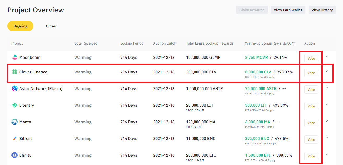 - Bước 2: Bạn sẽ lựa chọn dự án mình muốn hỗ trợ ở phía dưới. Giả sử trong trường hợp này mình chọn Clover Finance vì nó đang có APY cao nhất (793.37%). Tiếp đến, mình sẽ chọn Vote.