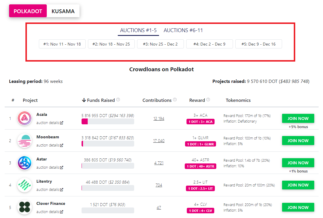 Phiên đấu giá đầu tiên trên mạng lưới Polkadot sẽ diễn ra vào ngày 11/11/2021 tới đây. Người dùng có thể stake đồng DOT của họ để hỗ trợ cho các dự án tiềm năng, chiến thắng cuộc đấu giá trên Polkadot.