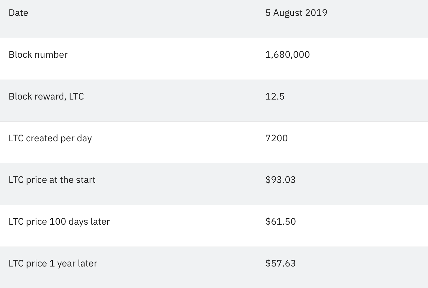 Tháng 8/2019 chứng kiến sự kiện Litecoin Halving thứ hai diễn ra. Nó khiến phần thưởng của những người khai thác giảm xuống còn 12.5 LTC. Trong khoảng thời gian giữa Halving thứ nhất và Halving thứ hai, giá LTC đã thay đổi đáng kể. Từ mức giá 4 USD ở lần Halving trước, giá LTC đã lên tới hơn 250 USD. Kể từ sự kiện Litecoin Halving này, LTC đã phần nào ổn định ở mức hỗ trợ 100 USD sau khi đã giảm đều đặn trong bốn tháng sau đó.