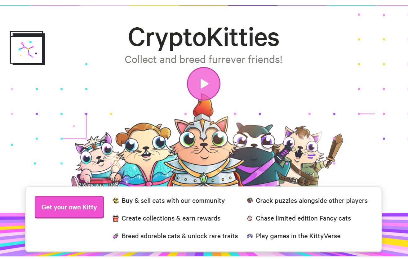 CryptoKitties là một dApp đã thúc đẩy các trò chơi trên Ethereum gần hơn với xu hướng chơi game phổ biến hiện nay. Tương tự như Neopets hoặc Tamogachi, CryptoKitties hoạt động trên nền tảng web. Nó cho phép người chơi nhân ra những giống mèo ảo độc đáo. Và giống mèo đó được đại diện bằng một lượng tokens duy nhất không có tính chất thay thế. Hay còn gọi là Non-Fungible Token (NFT).