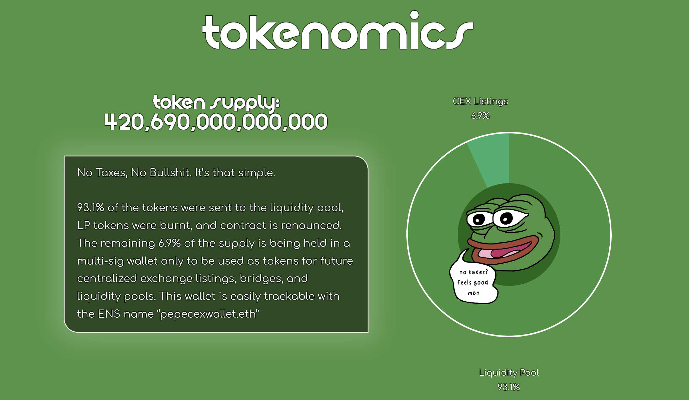 Tiền điện tử PEPE được phát triển trên mạng Ethereum (ETH) và tuân theo chuẩn ERC-20. Như BeInCrypto đã chia sẻ ở trên, tiền điện tử PEPE có tổng cung 420,690,000,000,000. Không giống như một số đồng tiền khác khi dành một phần lớn cho các nhà đầu tư ban đầu hoặc nhóm phát triển, tiền điện tử PEPE được phân phối với 93.1% cho Liquidity pool và 6.9% cho ví đa chữ ký (multi-sig) do nhóm phát triển nắm giữ, được dành riêng cho việc niêm yết các sàn giao dịch, cộng đồng trong tương lai quan hệ đối tác, khuyến mãi…