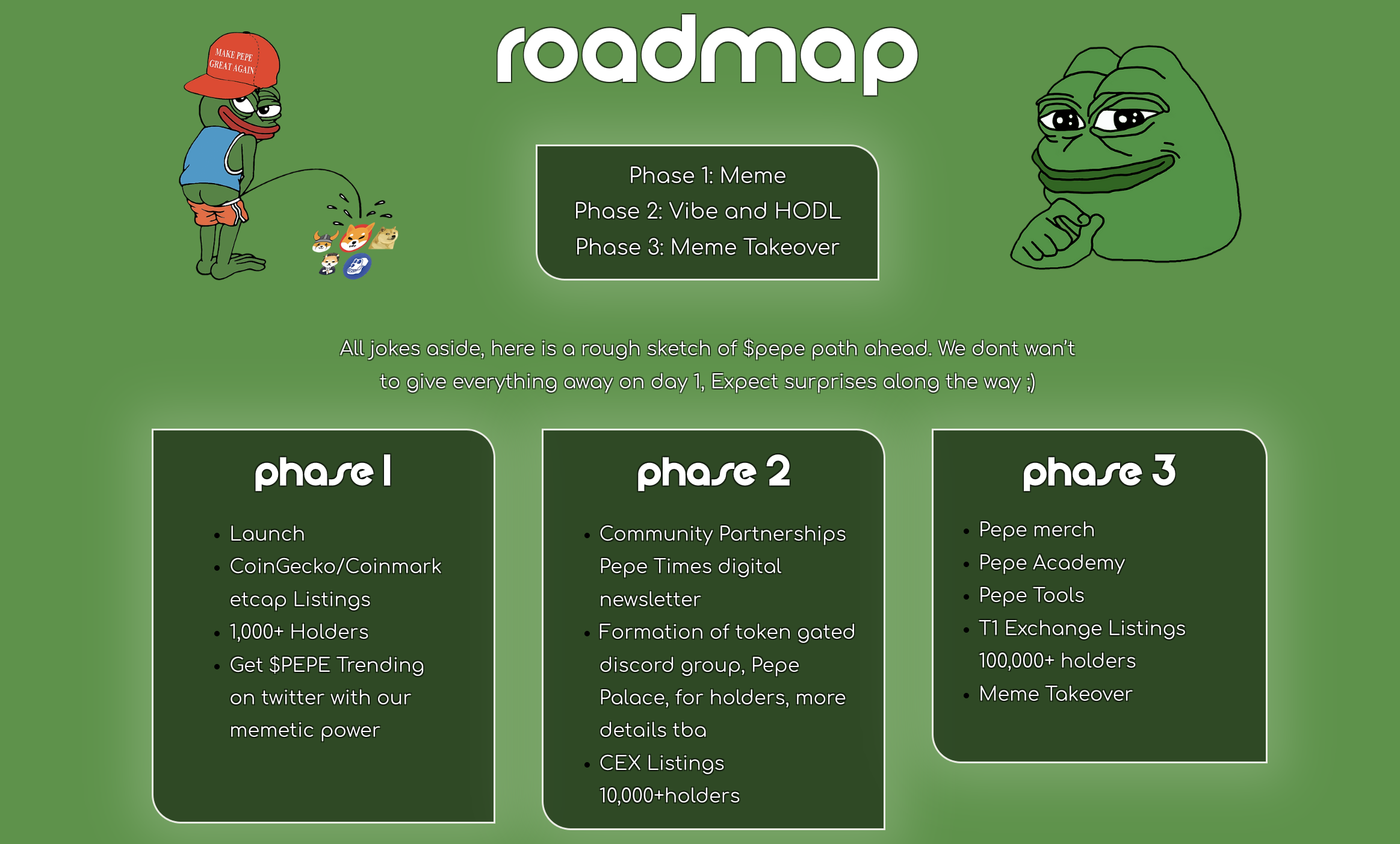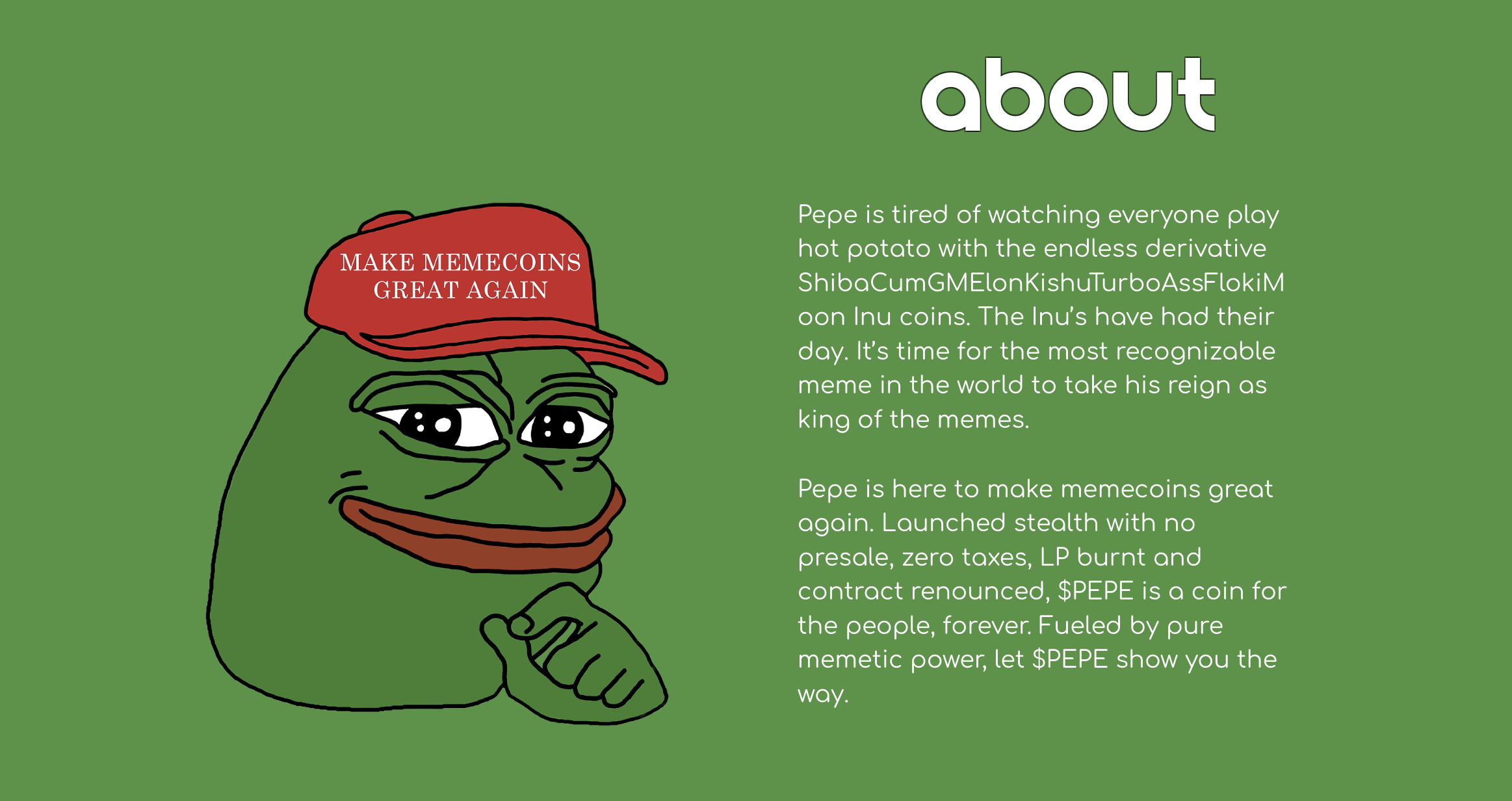 Đương nhiên, nhóm đằng sau PEPE không đưa ra tuyên bố nào về mối liên hệ với Pepe the Frog. Mục tiêu của mã thông báo này chỉ đơn giản là bày tỏ lòng kính trọng đối với một meme mà tất cả chúng ta đều yêu thích và công nhận. Chấm hết!