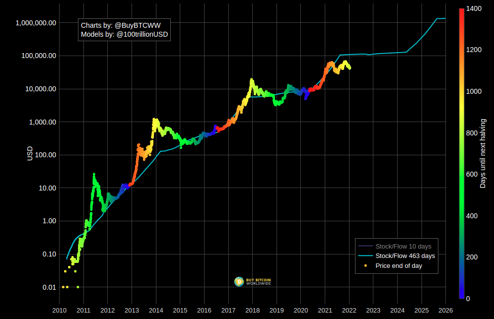 Trong mô hình này, Bitcoin Halving đóng vai trò rất quan trọng. Nó vừa mang ý nghĩa tăng lưu lượng, nhưng lại vừa “tăng” sự khan hiếm vì nó càng ngày càng đưa ít (đến mức rất ít) BTC vào thị trường hơn. Trong khi đó, nguồn cung thì lại cố định, nên mối quan hệ tuyến tính giữa giá và SF này có thể đẩy giá BTC lên đến 1 triệu USD trong chưa đầy 10 năm tới.