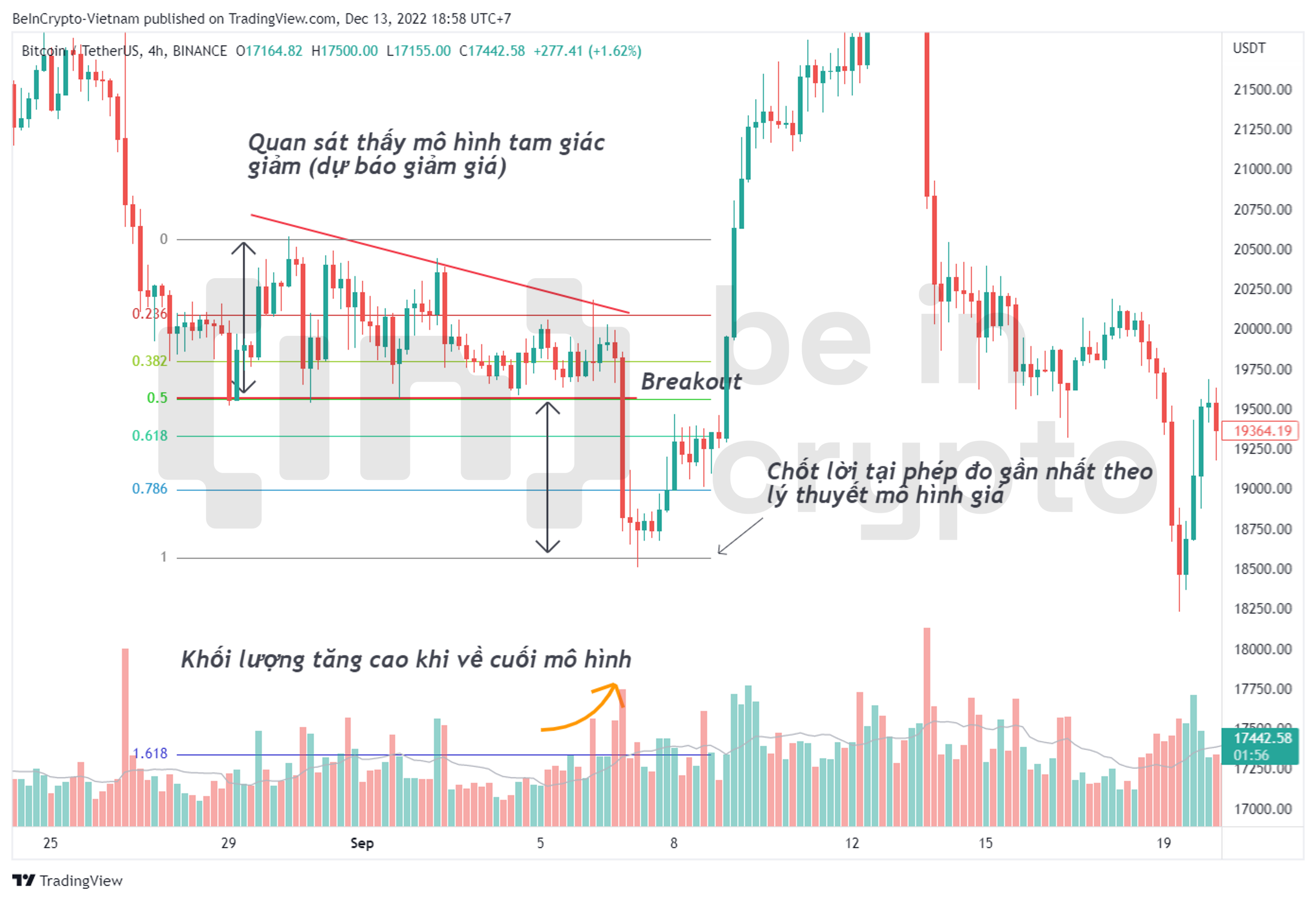 - Bước 4: Hành động nhanh chốt lời dựa theo phép đo giá của mô hình giá đó. Nếu mô hình giá có nhiều phép đo target khác nhau thì hãy chọn target gần nhất. Ví dụ trên, target lại biên độ gấp đôi chiều cao của tam giác, tức fibo 1.