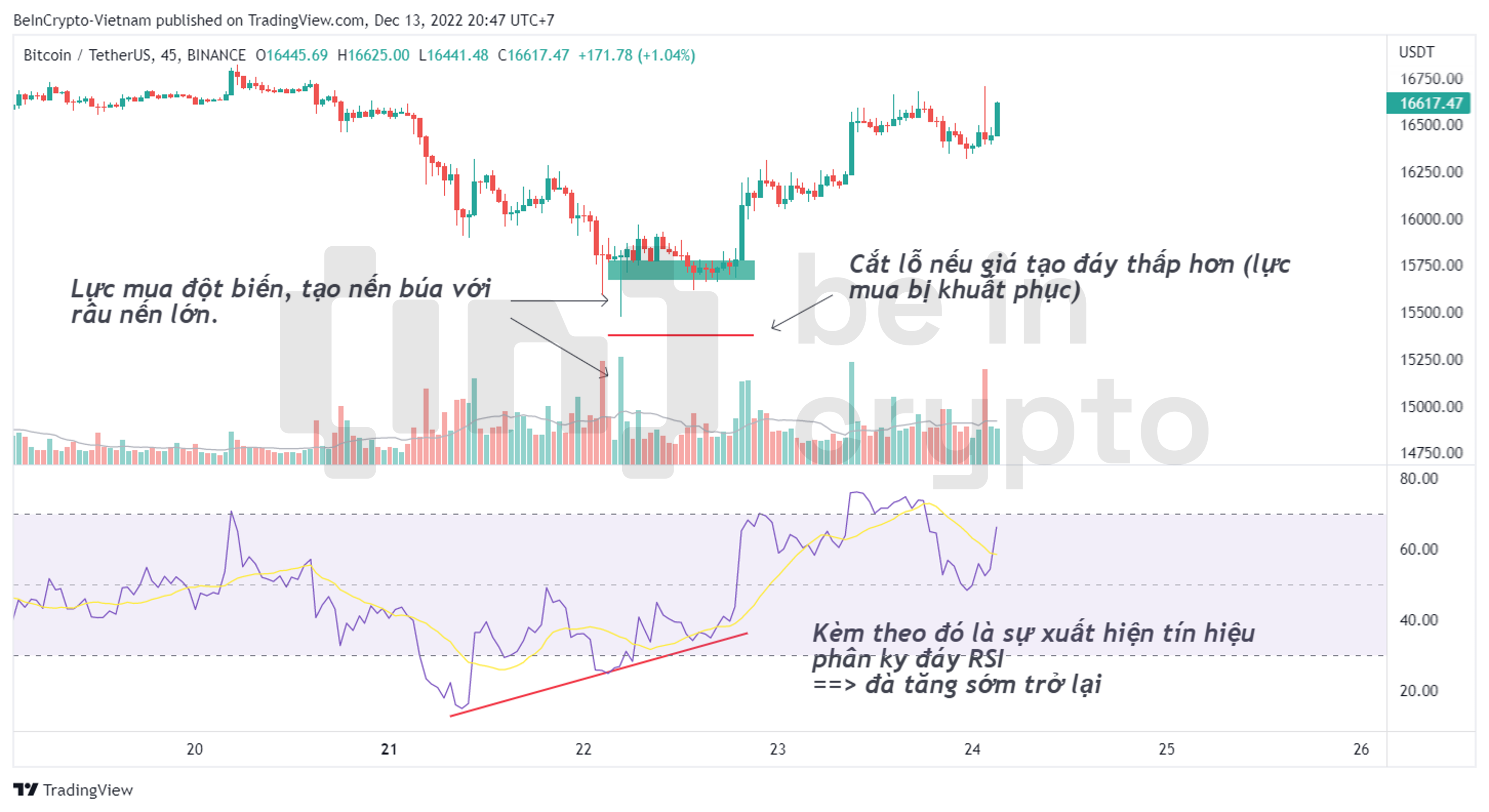 - Bước 2: Liên tục quan sát khối lượng. Bất kể khi nào có sự đột biến về khối lượng đều cần đòi hỏi phải theo sát thị trường hơn (hoặc dùng bot để hỗ trợ). Đã có lúc khối lượng bán đột biến nhưng không phá hỗ trợ, thì tiếp tục chờ đợi.