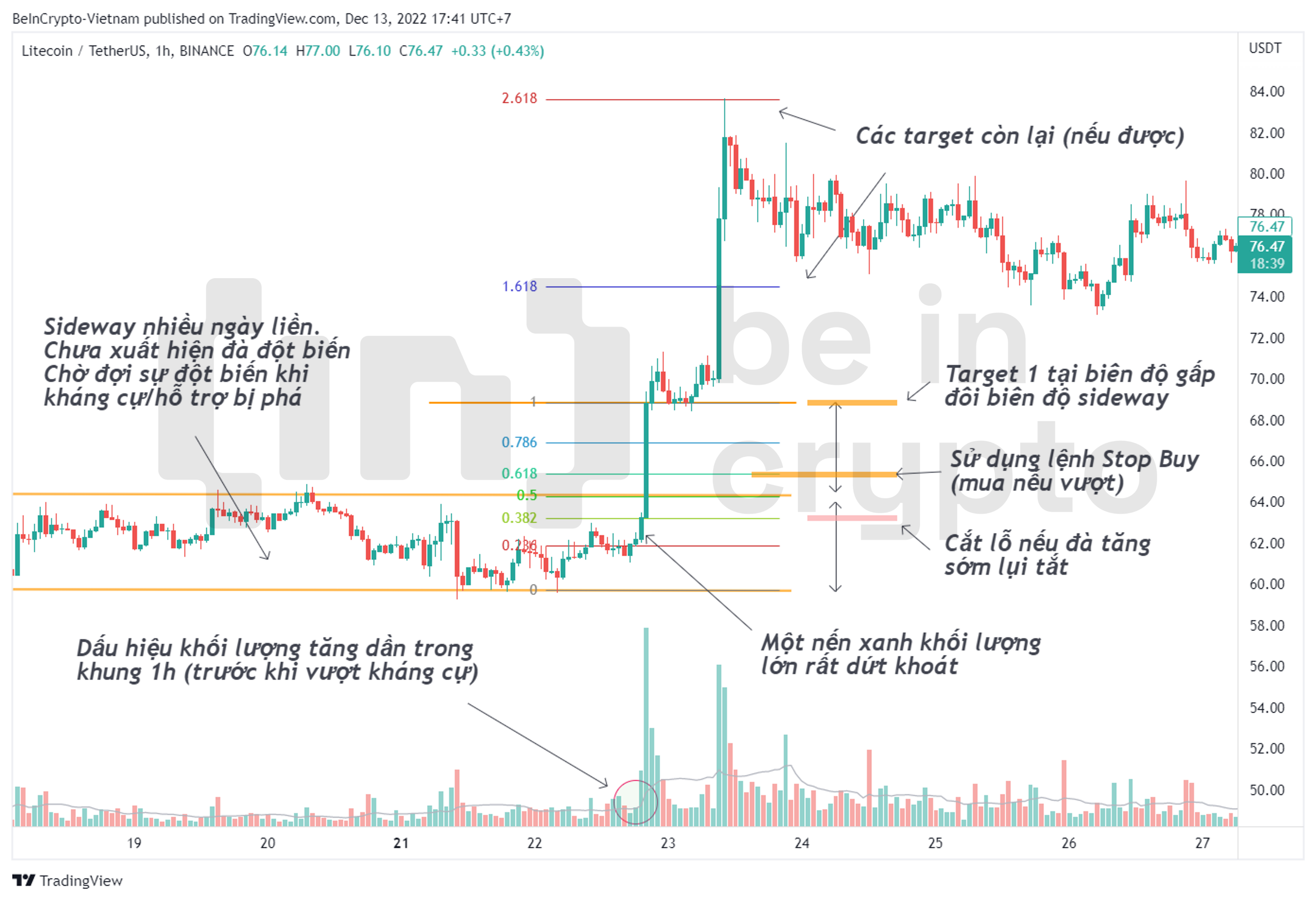 - Bước 4: Hành động nhanh là chốt lời tại biên độ gấp đôi biên độ sideway, tức fibo 1. Và dĩ nhiên, cũng phải kỷ luật cắt lỗ nhanh nếu giá quay trở lại vào trong biên sideway (false breakout). Những target chốt lời còn lại không nên quá kỳ vọng mà nên gài stop limit và chờ đợi.