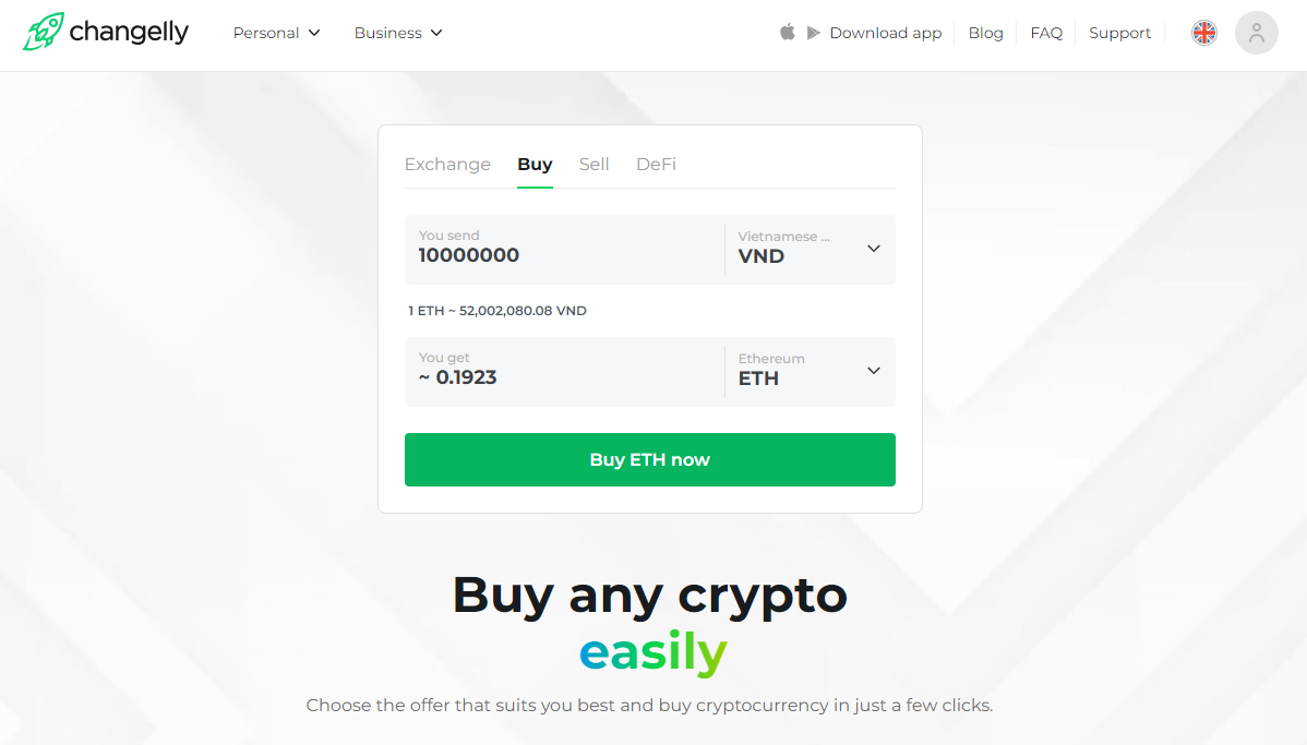 Với sàn Changelly, bạn truy cập vào đường link trang chủ tại địa chỉ https://changelly.com/. Bạn tiến hành đăng nhập tài khoản để có thể bắt đầu. Sau đó, bạn chọn mục “Buy” và giao diện sẽ hiển thị như hình dưới đây. Tương tự như OKX, bạn chọn loại tiền VND và nhập số tiền muốn chi trả. Phần dưới bạn chọn ETH và hệ thống sẽ tự quy đổi dựa trên tỷ giá tại thời điểm đó. Nếu đồng ý với tỷ giá này, bạn bấm chọn “Buy ETH now”.